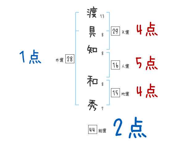 人運![]() | 渡具知和秀さんの人運は16画の5つ星!人望が厚く大きく発展する。逆転成功が見える。 性格や才能などを表す2番目に重要な運勢です。人間関係や協調性、社会的な成功に影響します。主に20歳から50歳ぐらいまでの中年期の運勢を表します。 |