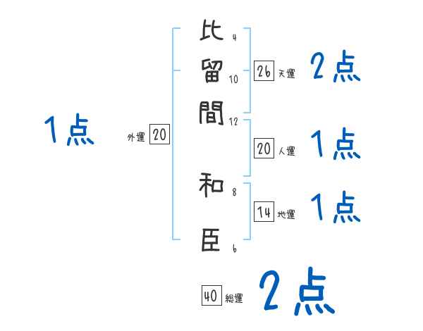 | 人運  | 比留間和臣さんの人運は20画の1つ星!社交が苦手。人とは違った才能があり波乱万丈な人生かも。性格や才能などを表す2番目に重要な運勢です。人間関係や協調性、社会的な成功に影響します。主に20歳から50歳ぐらいまでの中年期の運勢を表します。 |