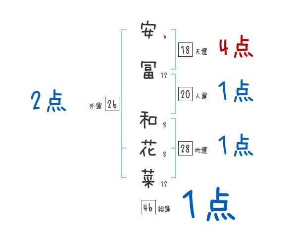 外運![]() | 安冨和花菜さんの外運は26画の2つ星!波瀾万丈かも。信頼できる人を大事にしましょう。 生活面を象徴する運勢です。外部から受ける影響力を表し、結婚運、家庭運や職場、環境への順応性を表します。 |