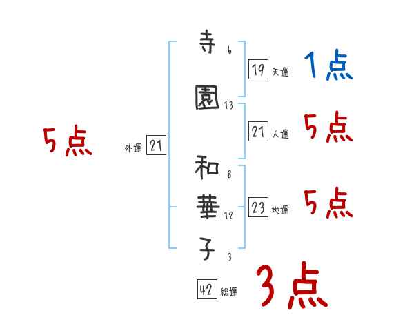 人運![]() | 寺園和華子さんの人運は21画の5つ星!統率力がある。独立し成功する。名誉を手に入れる。 性格や才能などを表す2番目に重要な運勢です。人間関係や協調性、社会的な成功に影響します。主に20歳から50歳ぐらいまでの中年期の運勢を表します。 |