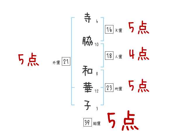 総運![]() | 寺脇和華子さんの総運は39画の5つ星!社交性に優れ人望が厚い。人の上に立ち成功する。 あなたの人生を表す1番重要な運勢です。生涯を通じて影響する総合運となり、主に50歳以降の晩年期に影響を及ぼします。 |
