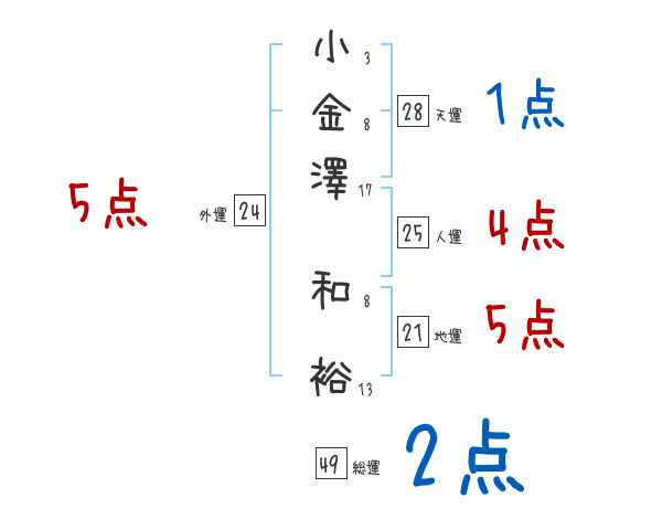 天運![]() | 小金澤和裕さんの天運は28画の1つ星!家庭環境に注意。スポーツで活躍できる能力があるかも。 家系が持つ宿命的な運勢を表します。祖先から受け継いだ苗字ですので自分の力が及びません。家柄を象徴します。 |