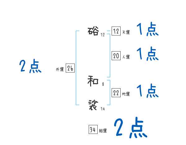 天運![]() | 硲和裟さんの天運は12画の1つ星!簡単な失敗で諦めてしまいやすいかも。着実に行動すると良いでしょう。 家系が持つ宿命的な運勢を表します。祖先から受け継いだ苗字ですので自分の力が及びません。家柄を象徴します。 |