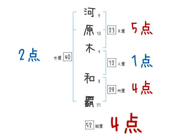 天運![]() | 河原木和覇さんの天運は23画の5つ星!想像力に優れ活力がある。一代で成功し名誉を手に入れる。 家系が持つ宿命的な運勢を表します。祖先から受け継いだ苗字ですので自分の力が及びません。家柄を象徴します。 |