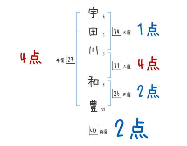 外運![]() | 宇田川和豊さんの外運は29画の4つ星!完全主義で才能がある。厳格な心の持ち主。 生活面を象徴する運勢です。外部から受ける影響力を表し、結婚運、家庭運や職場、環境への順応性を表します。 |