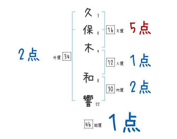 総運![]() | 久保木和響さんの総運は46画の1つ星!迷走することが多く苦労するかも。目先のことにとらわれないように。 あなたの人生を表す1番重要な運勢です。生涯を通じて影響する総合運となり、主に50歳以降の晩年期に影響を及ぼします。 |