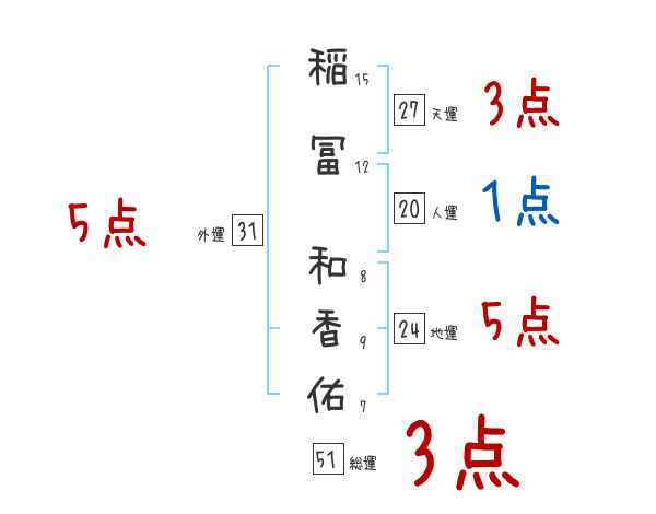 総運![]() | 稲冨和香佑さんの総運は51画の3つ星!変化が激しく、危険に注意。堅実な性格。 あなたの人生を表す1番重要な運勢です。生涯を通じて影響する総合運となり、主に50歳以降の晩年期に影響を及ぼします。 |