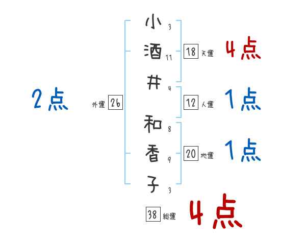 天運![]() | 小酒井和香子さんの天運は18画の4つ星!情熱的で剛気。忍耐力があり信頼される。 家系が持つ宿命的な運勢を表します。祖先から受け継いだ苗字ですので自分の力が及びません。家柄を象徴します。 |