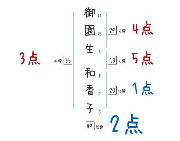 外運![]() | 御園生和香子さんの外運は36画の3つ星!先見性が豊かです。多少神経質で苦労することも。 生活面を象徴する運勢です。外部から受ける影響力を表し、結婚運、家庭運や職場、環境への順応性を表します。 |