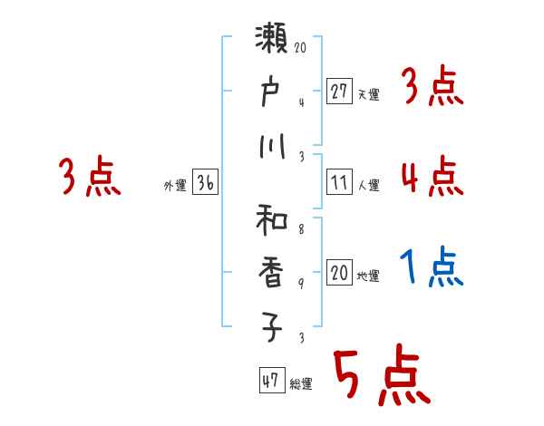 総運![]() | 瀬戸川和香子さんの総運は47画の5つ星!実力が開花し発展する円満な人生。財に恵まれる。 あなたの人生を表す1番重要な運勢です。生涯を通じて影響する総合運となり、主に50歳以降の晩年期に影響を及ぼします。 |