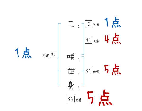 天運![]() | 二咲世身さんの天運は2画の1つ星!優しいですが積極性や意思の強さに欠ける傾向があります。家庭環境の乱れに注意しましょう。 家系が持つ宿命的な運勢を表します。祖先から受け継いだ苗字ですので自分の力が及びません。家柄を象徴します。 |