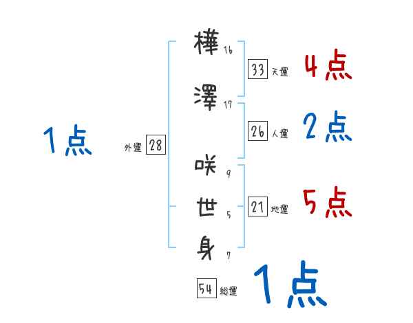 総運![]() | 樺澤咲世身さんの総運は54画の1つ星!トラブルが多いかも。周りをよく見て協調して過ごしましょう。 あなたの人生を表す1番重要な運勢です。生涯を通じて影響する総合運となり、主に50歳以降の晩年期に影響を及ぼします。 |