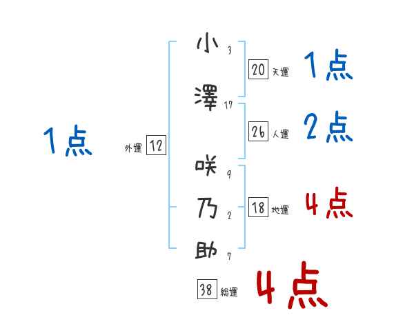 人運![]() | 小澤咲乃助さんの人運は26画の2つ星!波瀾万丈かも。信頼できる人を大事にしましょう。 性格や才能などを表す2番目に重要な運勢です。人間関係や協調性、社会的な成功に影響します。主に20歳から50歳ぐらいまでの中年期の運勢を表します。 |