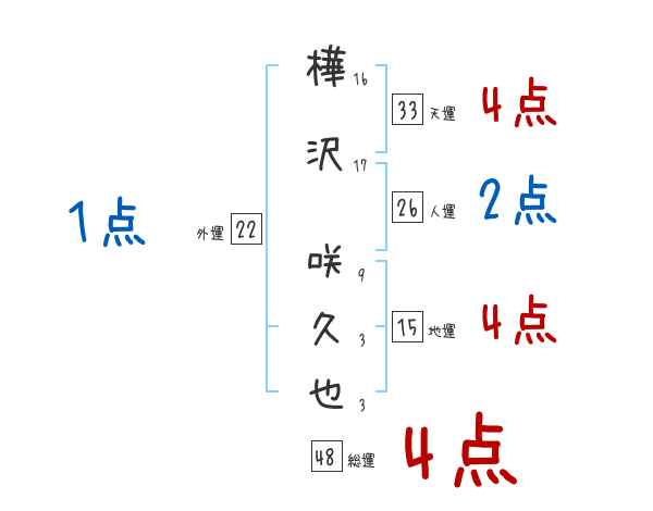 天運![]() | 樺沢咲久也さんの天運は33画の4つ星!権力志向でプライドが高い。勇気があり運を切り開き成功する。 家系が持つ宿命的な運勢を表します。祖先から受け継いだ苗字ですので自分の力が及びません。家柄を象徴します。 |