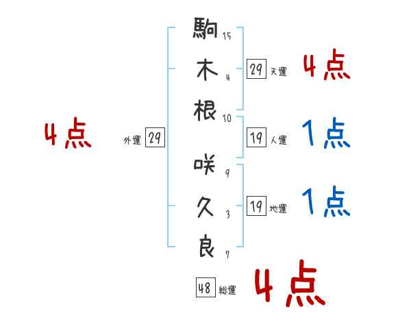 天運![]() | 駒木根咲久良さんの天運は29画の4つ星!完全主義で才能がある。厳格な心の持ち主。 家系が持つ宿命的な運勢を表します。祖先から受け継いだ苗字ですので自分の力が及びません。家柄を象徴します。 |
