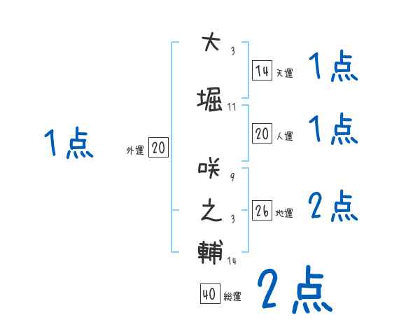 天運![]() | 大堀咲之輔さんの天運は14画の1つ星!人に対して優しいがストレスを溜め込みがち。人間関係のトラブルを避けるよう気をつけましょう。 家系が持つ宿命的な運勢を表します。祖先から受け継いだ苗字ですので自分の力が及びません。家柄を象徴します。 |