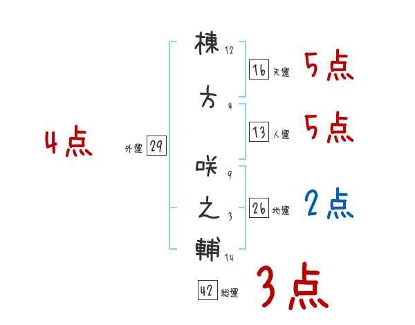 | 天運  | 棟方咲之輔さんの天運は16画の5つ星!人望が厚く大きく発展する。逆転成功が見える。家系が持つ宿命的な運勢を表します。祖先から受け継いだ苗字ですので自分の力が及びません。家柄を象徴します。 |