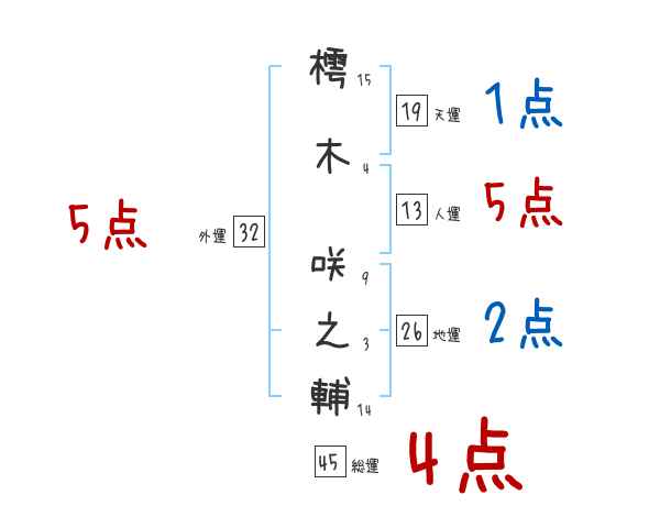 外運![]() | 樗木咲之輔さんの外運は32画の5つ星!柔軟性があり成功する。チャンスが多く金運が良い。 生活面を象徴する運勢です。外部から受ける影響力を表し、結婚運、家庭運や職場、環境への順応性を表します。 |