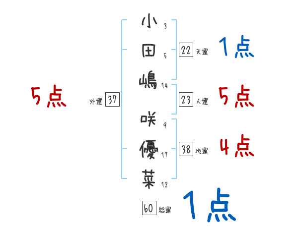 人運![]() | 小田嶋咲優菜さんの人運は23画の5つ星!想像力に優れ活力がある。一代で成功し名誉を手に入れる。 性格や才能などを表す2番目に重要な運勢です。人間関係や協調性、社会的な成功に影響します。主に20歳から50歳ぐらいまでの中年期の運勢を表します。 |