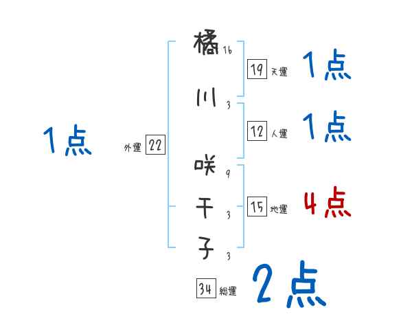 天運![]() | 橘川咲千子さんの天運は19画の1つ星!優れた才能を持ちますが、協調性が足りないことも。周りの人と協力する事を意識しましょう。 家系が持つ宿命的な運勢を表します。祖先から受け継いだ苗字ですので自分の力が及びません。家柄を象徴します。 |
