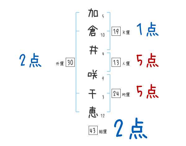 天運![]() | 加倉井咲千恵さんの天運は19画の1つ星!優れた才能を持ちますが、協調性が足りないことも。周りの人と協力する事を意識しましょう。 家系が持つ宿命的な運勢を表します。祖先から受け継いだ苗字ですので自分の力が及びません。家柄を象徴します。 |
