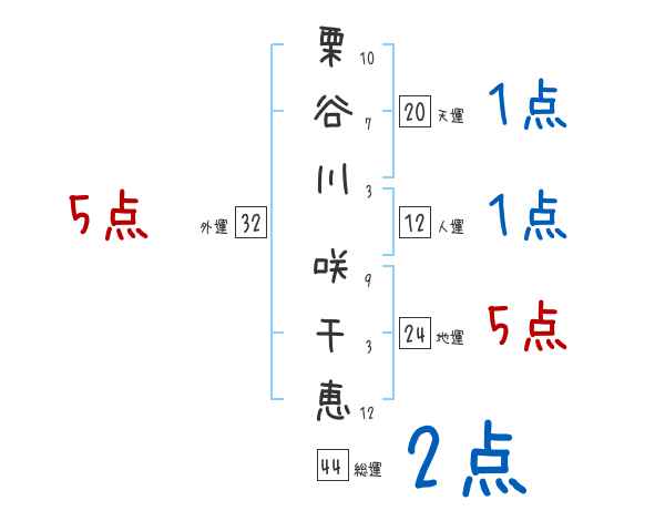 外運![]() | 栗谷川咲千恵さんの外運は32画の5つ星!柔軟性があり成功する。チャンスが多く金運が良い。 生活面を象徴する運勢です。外部から受ける影響力を表し、結婚運、家庭運や職場、環境への順応性を表します。 |