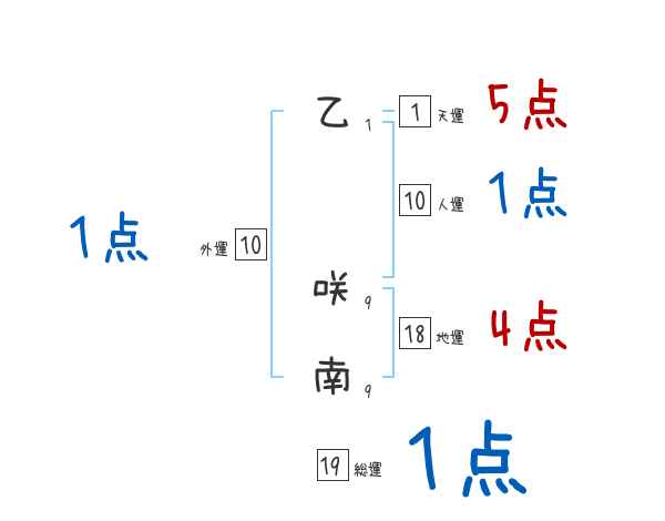 天運![]() | 乙咲南さんの天運は1画の5つ星!行動力、指導力があり出世し繁栄する。幸運に恵まれる。 家系が持つ宿命的な運勢を表します。祖先から受け継いだ苗字ですので自分の力が及びません。家柄を象徴します。 |