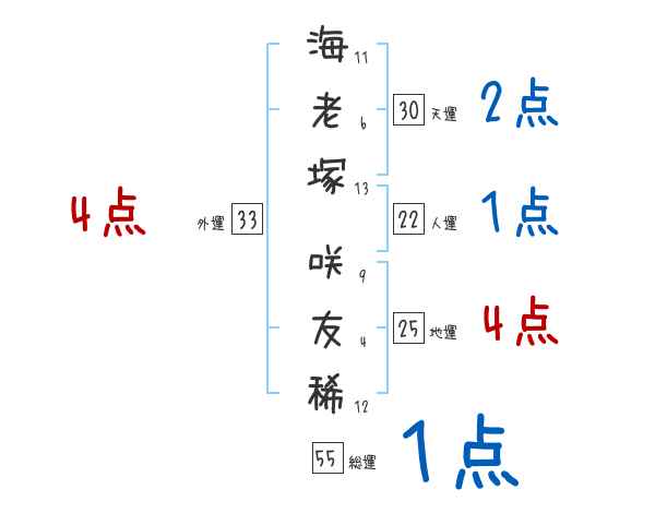 総運![]() | 海老塚咲友稀さんの総運は55画の1つ星!欲張りな性格で軽率な行動に注意しましょう。病気に気をつけて。 あなたの人生を表す1番重要な運勢です。生涯を通じて影響する総合運となり、主に50歳以降の晩年期に影響を及ぼします。 |