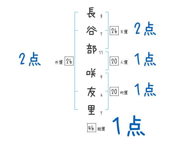 天運![]() | 長谷部咲友里さんの天運は26画の2つ星!波瀾万丈かも。信頼できる人を大事にしましょう。 家系が持つ宿命的な運勢を表します。祖先から受け継いだ苗字ですので自分の力が及びません。家柄を象徴します。 |