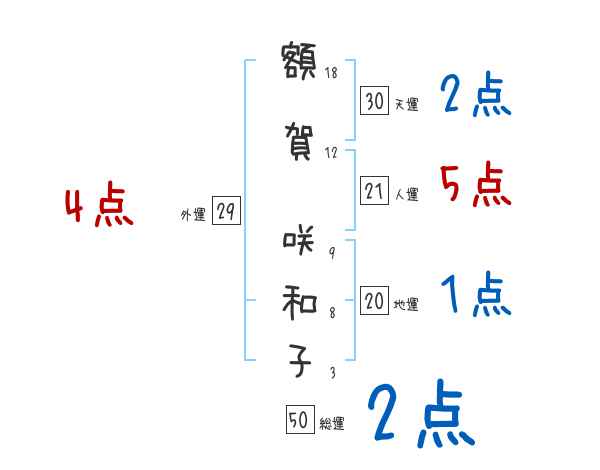 外運![]() | 額賀咲和子さんの外運は29画の4つ星!完全主義で才能がある。厳格な心の持ち主。 生活面を象徴する運勢です。外部から受ける影響力を表し、結婚運、家庭運や職場、環境への順応性を表します。 |