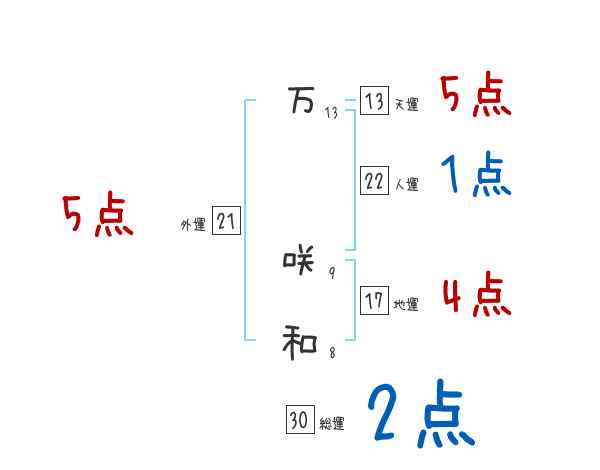 天運![]() | 万咲和さんの天運は13画の5つ星!才能に恵まれ人気がある。名声を手に入れる。円満な人生。 家系が持つ宿命的な運勢を表します。祖先から受け継いだ苗字ですので自分の力が及びません。家柄を象徴します。 |