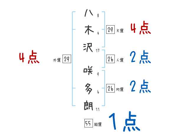 天運![]() | 八木沢咲多朗さんの天運は29画の4つ星!完全主義で才能がある。厳格な心の持ち主。 家系が持つ宿命的な運勢を表します。祖先から受け継いだ苗字ですので自分の力が及びません。家柄を象徴します。 |