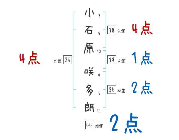 天運![]() | 小石原咲多朗さんの天運は18画の4つ星!情熱的で剛気。忍耐力があり信頼される。 家系が持つ宿命的な運勢を表します。祖先から受け継いだ苗字ですので自分の力が及びません。家柄を象徴します。 |