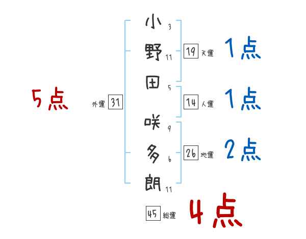 総運![]() | 小野田咲多朗さんの総運は45画の4つ星!もくもくと物事を進め達成する。地味な努力家。 あなたの人生を表す1番重要な運勢です。生涯を通じて影響する総合運となり、主に50歳以降の晩年期に影響を及ぼします。 |