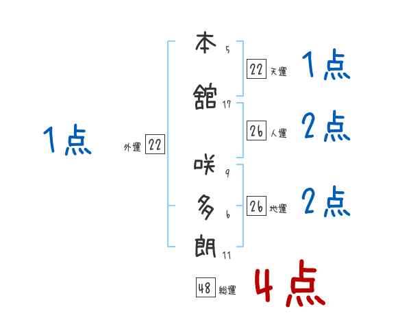 天運![]() | 本舘咲多朗さんの天運は22画の1つ星!努力することが苦手ないっぽう手先が器用。芸術性にも優れる。 家系が持つ宿命的な運勢を表します。祖先から受け継いだ苗字ですので自分の力が及びません。家柄を象徴します。 |