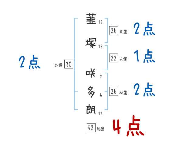 地運![]() | 韮塚咲多朗さんの地運は26画の2つ星!波瀾万丈かも。信頼できる人を大事にしましょう。 個性を表す基礎的な運勢です。性格形成や対人関係、行動力など家庭環境に影響されます。主に誕生してから20歳くらいまでの若年期の運勢を表します。 |