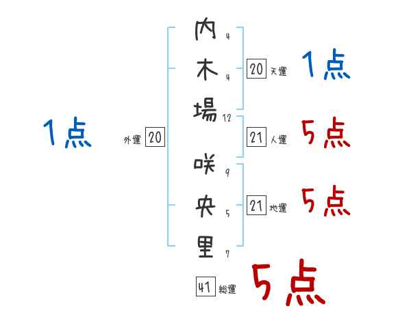人運![]() | 内木場咲央里さんの人運は21画の5つ星!統率力がある。独立し成功する。名誉を手に入れる。 性格や才能などを表す2番目に重要な運勢です。人間関係や協調性、社会的な成功に影響します。主に20歳から50歳ぐらいまでの中年期の運勢を表します。 |