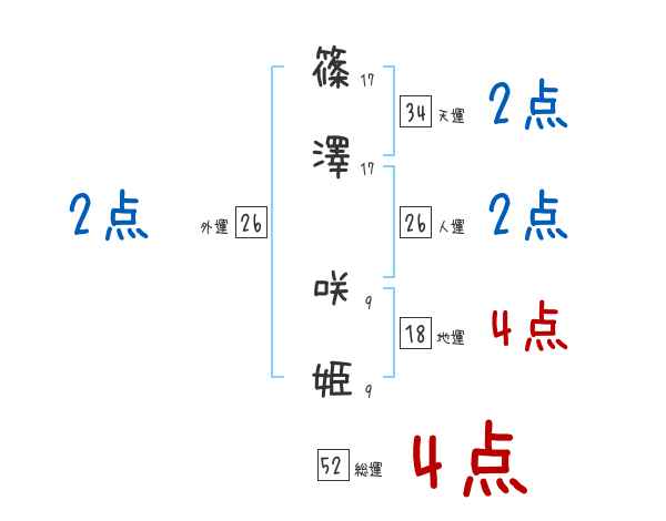 外運![]() | 篠澤咲姫さんの外運は26画の2つ星!波瀾万丈かも。信頼できる人を大事にしましょう。 生活面を象徴する運勢です。外部から受ける影響力を表し、結婚運、家庭運や職場、環境への順応性を表します。 |