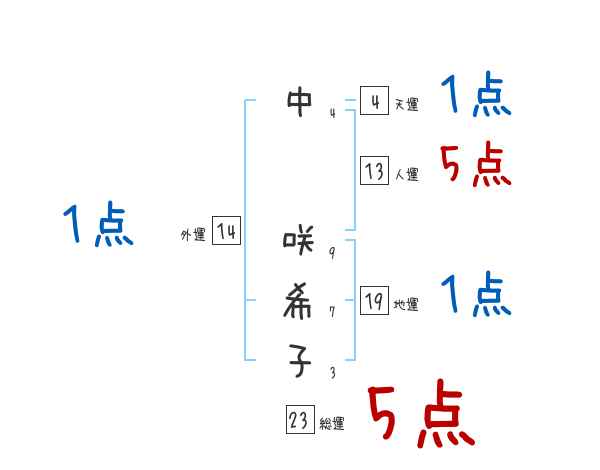 外運![]() | 中咲希子さんの外運は14画の1つ星!人に対して優しいがストレスを溜め込みがち。人間関係のトラブルを避けるよう気をつけましょう。 生活面を象徴する運勢です。外部から受ける影響力を表し、結婚運、家庭運や職場、環境への順応性を表します。 |