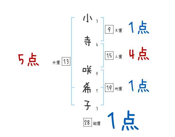 外運![]() | 小寺咲希子さんの外運は13画の5つ星!才能に恵まれ人気がある。名声を手に入れる。円満な人生。 生活面を象徴する運勢です。外部から受ける影響力を表し、結婚運、家庭運や職場、環境への順応性を表します。 |
