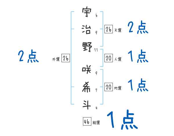 天運![]() | 宇治野咲希斗さんの天運は26画の2つ星!波瀾万丈かも。信頼できる人を大事にしましょう。 家系が持つ宿命的な運勢を表します。祖先から受け継いだ苗字ですので自分の力が及びません。家柄を象徴します。 |