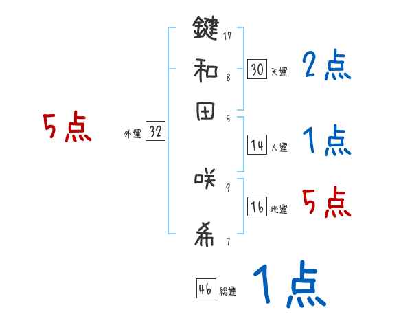 外運![]() | 鍵和田咲希さんの外運は32画の5つ星!柔軟性があり成功する。チャンスが多く金運が良い。 生活面を象徴する運勢です。外部から受ける影響力を表し、結婚運、家庭運や職場、環境への順応性を表します。 |