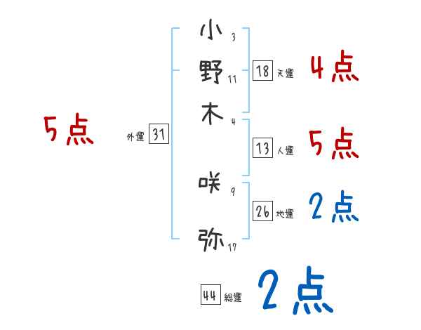 天運![]() | 小野木咲弥さんの天運は18画の4つ星!情熱的で剛気。忍耐力があり信頼される。 家系が持つ宿命的な運勢を表します。祖先から受け継いだ苗字ですので自分の力が及びません。家柄を象徴します。 |