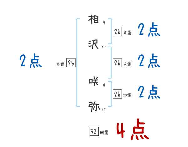 天運![]() | 相沢咲弥さんの天運は26画の2つ星!波瀾万丈かも。信頼できる人を大事にしましょう。 家系が持つ宿命的な運勢を表します。祖先から受け継いだ苗字ですので自分の力が及びません。家柄を象徴します。 |