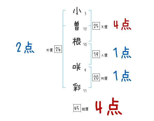 外運![]() | 小曽根咲彩さんの外運は26画の2つ星!波瀾万丈かも。信頼できる人を大事にしましょう。 生活面を象徴する運勢です。外部から受ける影響力を表し、結婚運、家庭運や職場、環境への順応性を表します。 |