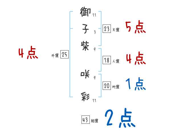 天運![]() | 御子柴咲彩さんの天運は23画の5つ星!想像力に優れ活力がある。一代で成功し名誉を手に入れる。 家系が持つ宿命的な運勢を表します。祖先から受け継いだ苗字ですので自分の力が及びません。家柄を象徴します。 |