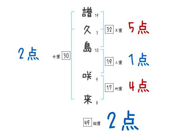 天運![]() | 譜久島咲来さんの天運は32画の5つ星!柔軟性があり成功する。チャンスが多く金運が良い。 家系が持つ宿命的な運勢を表します。祖先から受け継いだ苗字ですので自分の力が及びません。家柄を象徴します。 |