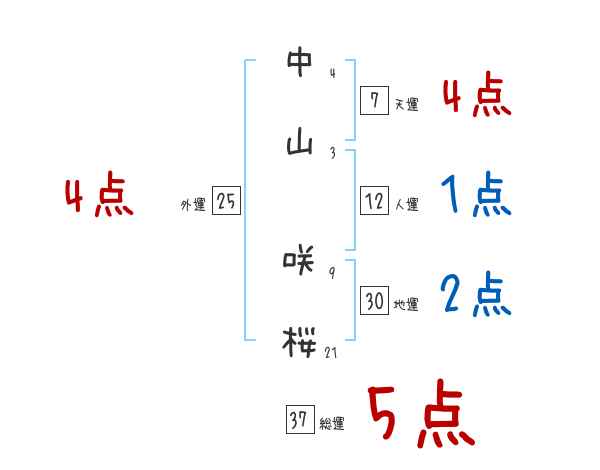 天運![]() | 中山咲桜さんの天運は7画の4つ星!強い意志や信念を持ち独立心が強い。自立する。 家系が持つ宿命的な運勢を表します。祖先から受け継いだ苗字ですので自分の力が及びません。家柄を象徴します。 |