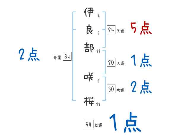 天運![]() | 伊良部咲桜さんの天運は24画の5つ星!家庭運が良く順調な人生。金運にも恵まれる。 家系が持つ宿命的な運勢を表します。祖先から受け継いだ苗字ですので自分の力が及びません。家柄を象徴します。 |