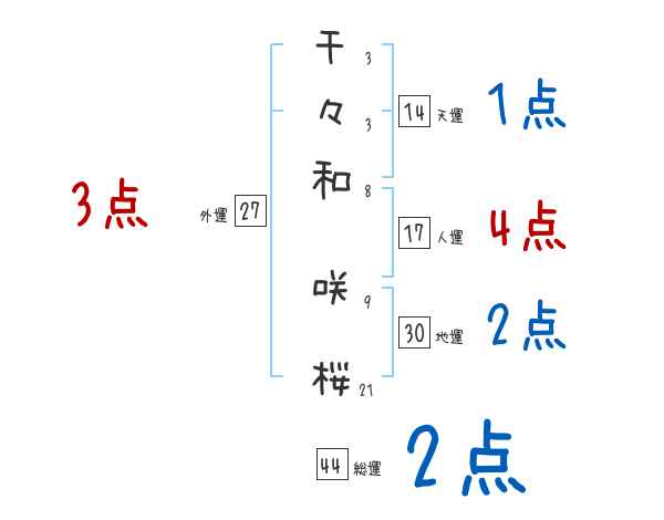 天運![]() | 千々和咲桜さんの天運は14画の1つ星!人に対して優しいがストレスを溜め込みがち。人間関係のトラブルを避けるよう気をつけましょう。 家系が持つ宿命的な運勢を表します。祖先から受け継いだ苗字ですので自分の力が及びません。家柄を象徴します。 |